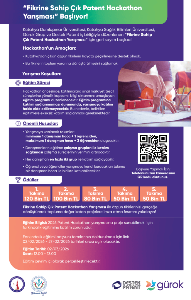 Kütahya Dumlupınar Üniversitesi, Kütahya Sağlık Bilimleri Üniversitesi, Gürok Grup ve Destek Patent iş birliğiyle düzenlenen Fikrine Sahip Çık Patent Hackathon Yarışması, Sınai Mülkiyet tescil süreçlerine yönelik kapsamlı bilgi aktarımını amaçlayan bir eğitim programı ile başlayacak.